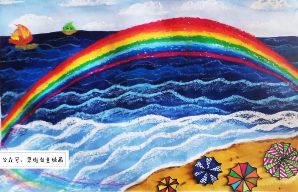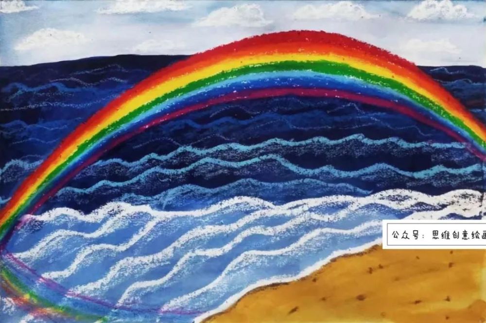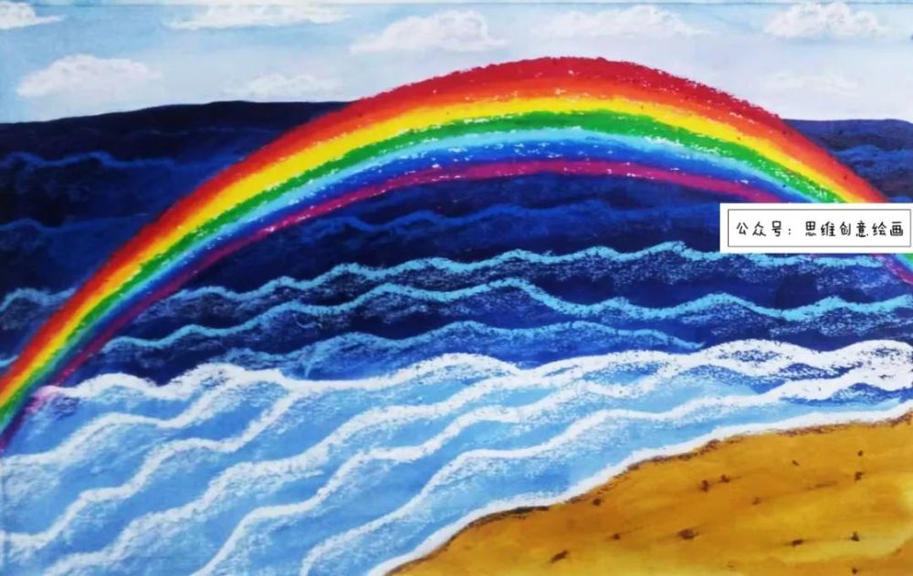 第二步:用重彩油画棒把彩虹和海浪画上,在海滩上用棕色画上点小石子。