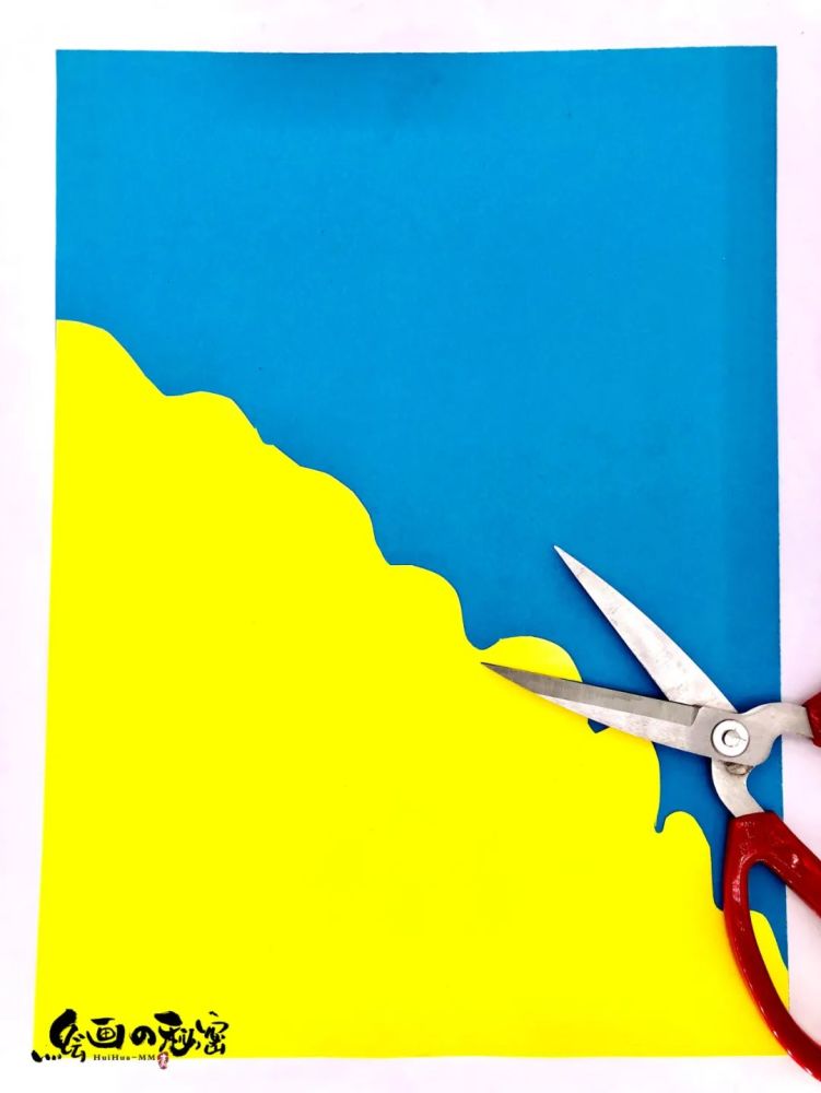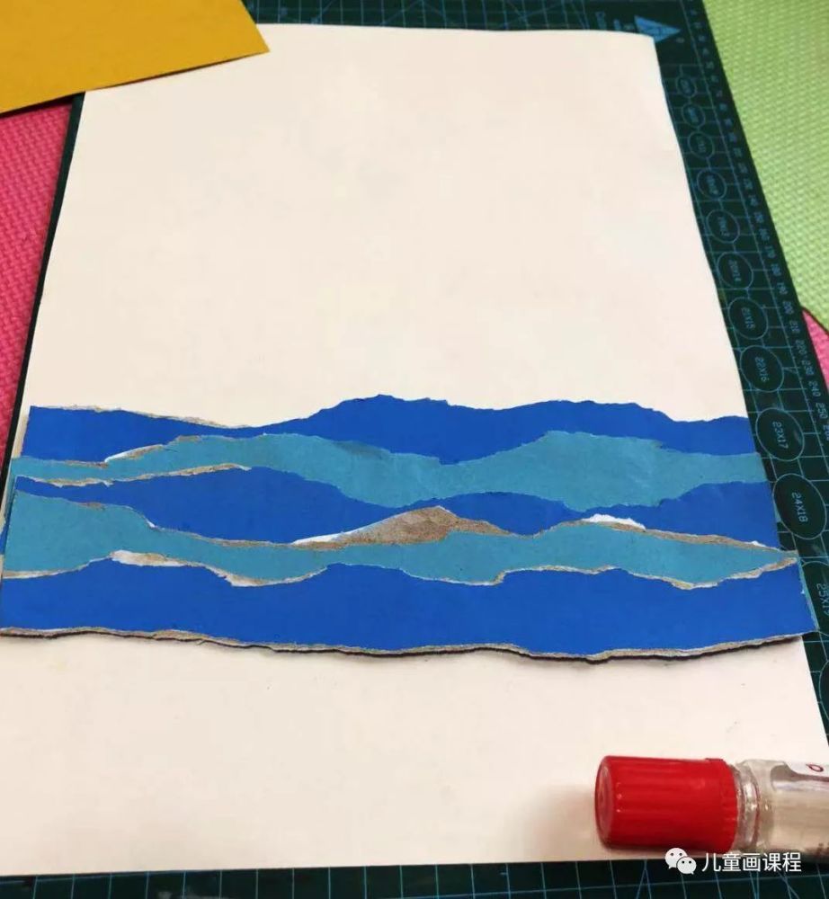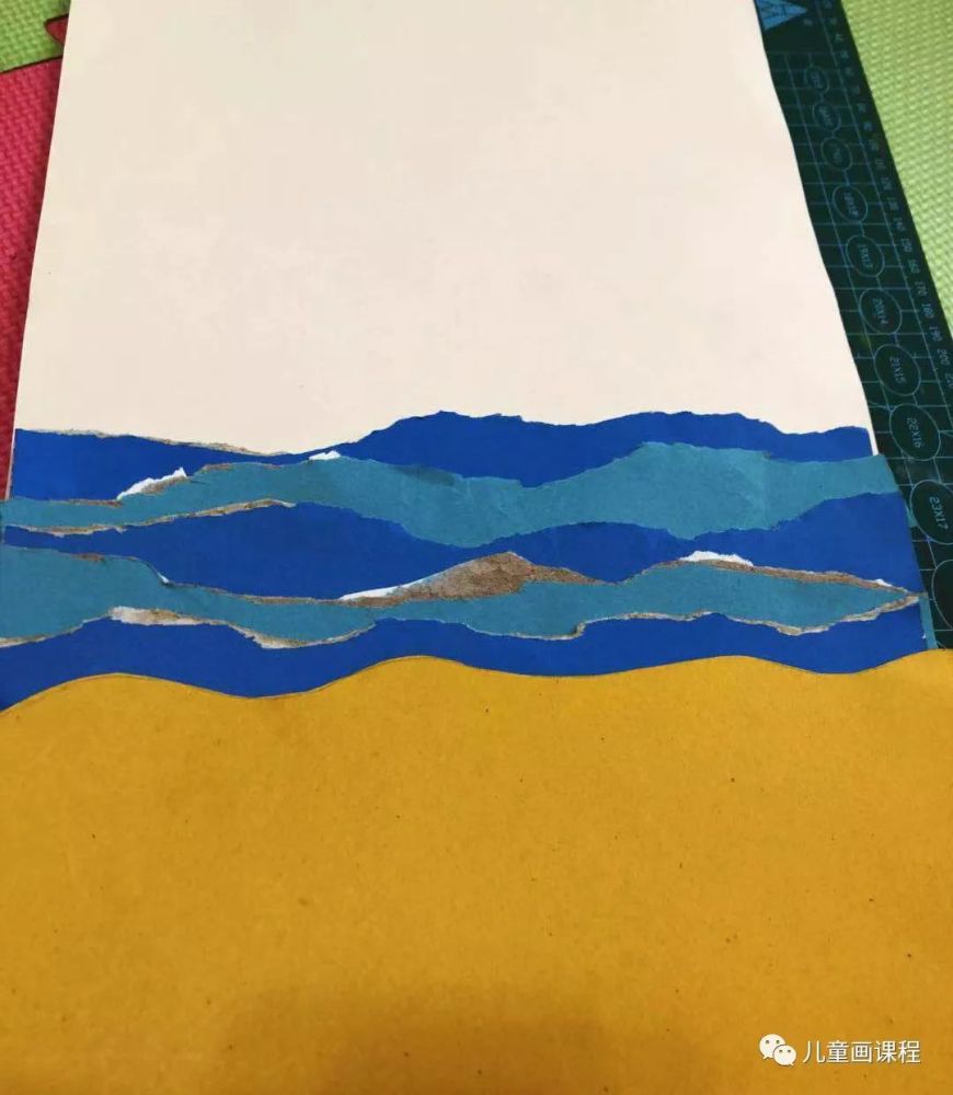 步骤一:我们先利用蓝色和黄色的卡纸制作沙滩和大海,注意边缘线的处理要有起伏变化。