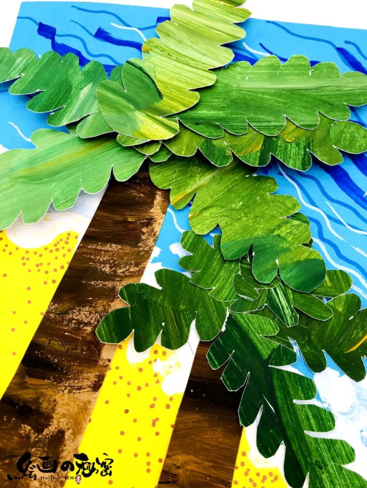 步骤五:利用拓印好的彩纸来制作椰子树的树干和树叶,叶片要有大小的区别哦,粘贴时也要有明显的高低对比。