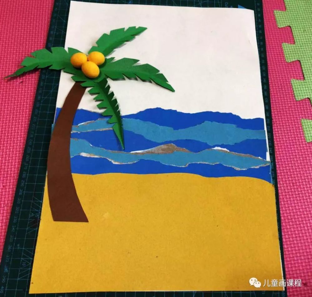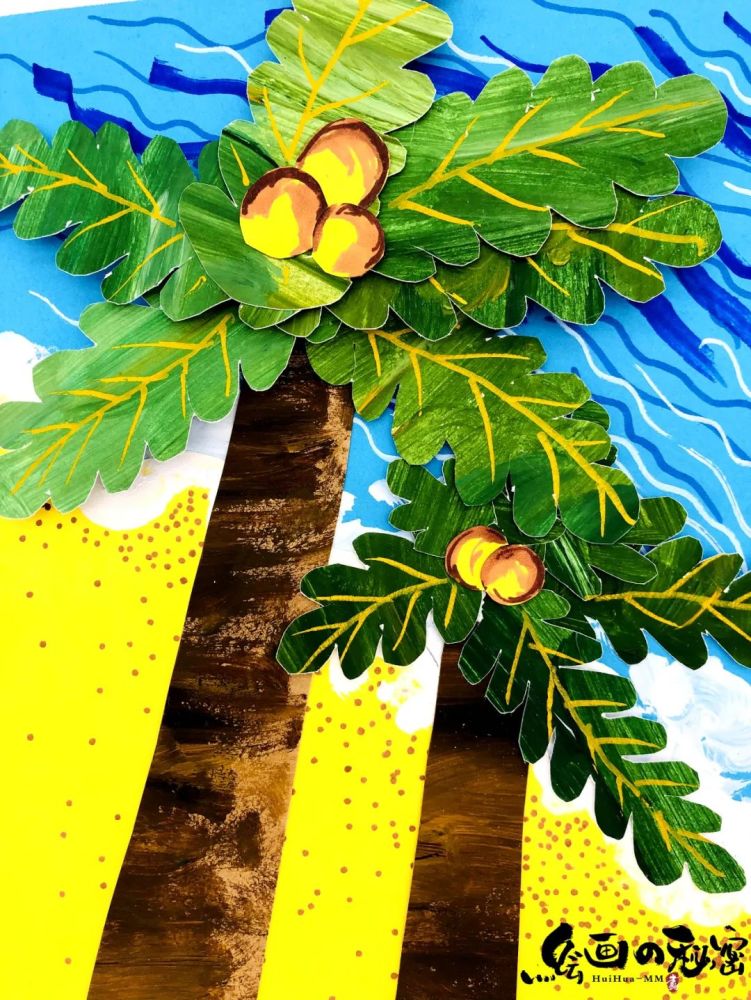3.用彩色卡纸剪出椰子树,超轻黏土做几个椰子粘在树上,使画面更生动。