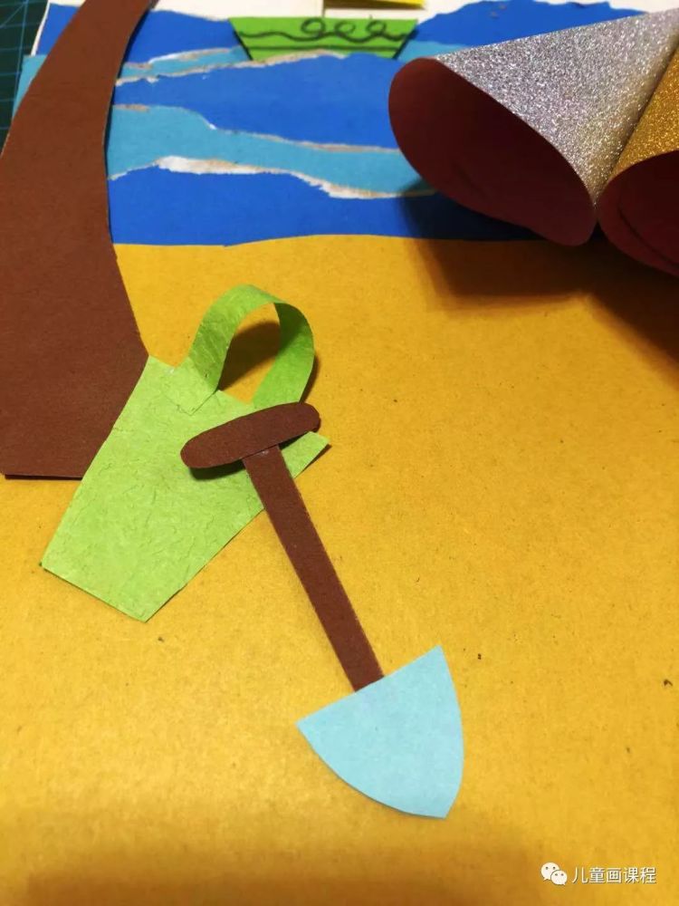 5.彩色卡纸剪贴一些沙滩工具,也可以画上一些贝壳、小螃蟹之类的,使画面更丰富。