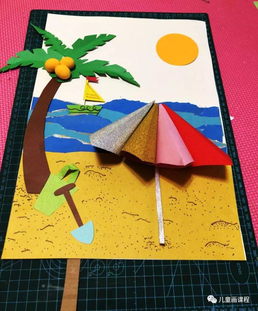 4.黄色卡纸剪出太阳,彩色卡纸做一个遮阳伞以及小船,小船做成这样可以移动的,更有趣哦!