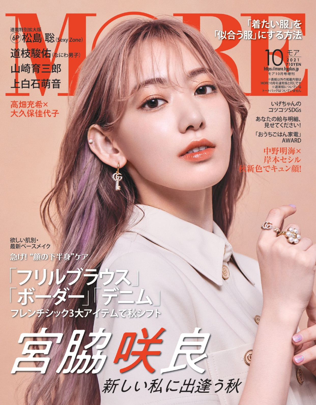 结束了女子组合“IZ*ONE”的演艺活动、从偶像组合“HKT48”毕业的宫脇咲良将首次登上即将8月27日发售的女性时尚杂志《MORE》的10月号的增刊的封面。宫胁咲良在拍摄封面前几天就染发了,是一种带有紫色和米色的粉色发型,同时展示了她穿着米色连衣裙的身姿。