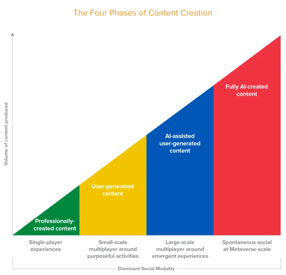 2020年12月,投资机构a16z官网发布文章,提出“内容生成的四个阶段”,依次为PGC、UGC、AI辅助生成和完全的AIGC[1]。