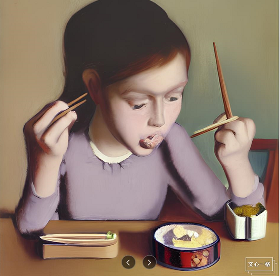 比如百度推出的AI作画产品“文心一格”,就给我创作了这么一张“双手持筷”的作品,而它的关键词是“一个用筷子吃盒饭的少女”。