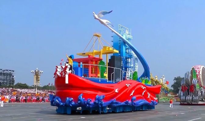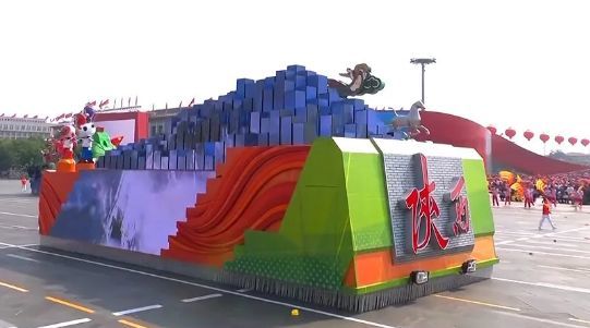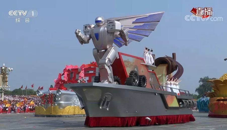 彩车上的元素从钢包钢水到大机器人、滚滚向前的齿轮组、旗型屏幕上雷锋等英模群像。银色彩带宛如辽河,六手联弹憧憬未来,芭蕾女孩曼舞轻飞,尽展辽宁文化之好、风物之美;振翅阔步的机器巨人,既代表辽宁装备制造的最高水平,又象征立地顶天的辽宁人。——辽宁日报