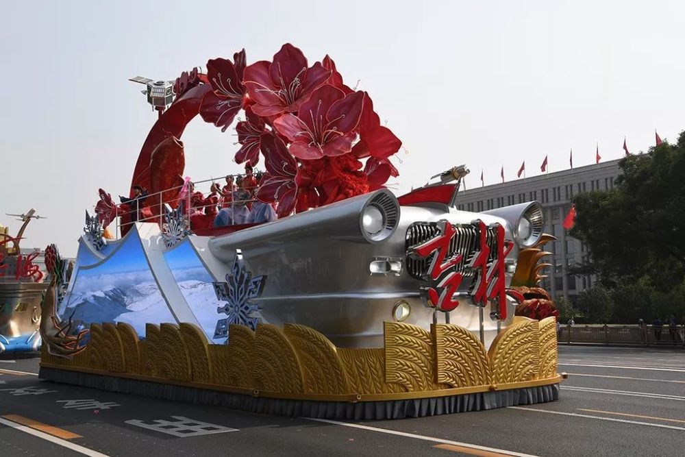 彩车车长15米,宽6米,高10米,将富有传奇神韵的长白山、红旗轿车、“吉林一号”卫星等主体设计元素完美融合,形成彩车的车身造型。两翼以长白山天池为设计元素,人参、稻穗、玉米以及跃起的鲤鱼,象征吉林大地喜获丰收、连年有余。——人民网吉林频道