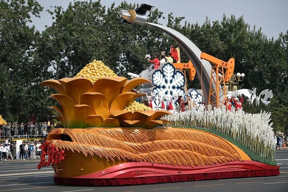 彩车宽6米、高10米、长15米。大粮仓、抽油机、雪花、“快舟一号”,这些鲜明的元素,让黑龙江彩车“中华粮仓”格外醒目。 摇曳在湿地中白色芦苇和丹顶鹤,旨在展示龙江得天独厚的自然生态环境,龙江大美湿地风采与韵味。彩车下方装饰有金色稻浪的雕塑和防火围幔。——黑龙江日报
