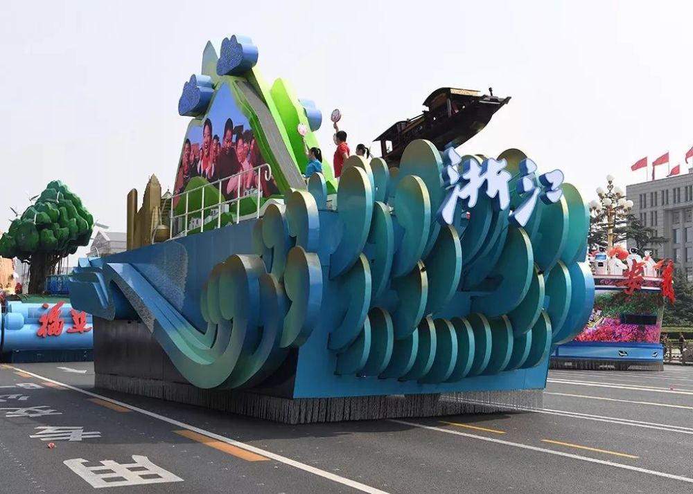 彩车长15.95米、宽6.03米、高9.3米。革命红船挺立在钱江潮上,寓意红船精神引领浙江劈波前行;车体两侧钱塘江“之”字段和车头壮阔澎湃的钱江潮,与山体LED屏播放的“最多跑一次”改革画面、山顶璀璨的智慧云和倾泻的云瀑布、山脚宁波舟山港场景融为一体;一幅生态美、人文美、生活美的新时代“富春山居图”,与现代城市建筑群、浙派民居交相辉映,描绘浙江建设美丽大花园、城乡协调发展、打造人文高地的美好画卷。——浙江日报