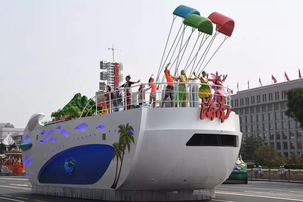 “美好新海南”号外观是一艘邮轮。邮轮前“海南”二字由黎锦图饰组成,寓意海南前程似锦。邮轮分海底、海面、空中三大空间立体呈现“美好新海南”。空中部分包括文昌航天发射场和风筝冲浪运动展示,以及五指山海南热带雨林公园腹地景观。3位演员扮演的“运动员”以海上风筝冲浪这一运动,表现海南“奋力向前”“迎风而上”的活力。——海南日报