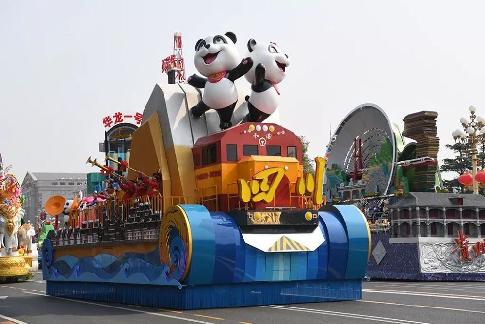 憨态可掬的大熊猫安安和逸逸被置于车头顶作为四川的形象标志;金山银山则象征了绿水青山,展现了天府四川沃野千里以及富饶美丽;奔驰的蓉欧快铁、新能源页岩气开发、核电技术华龙一号、电子信息墙等现代科技元素则象征了十八大以来具有四川特色的支柱产业和高科技发展;金沙太阳神鸟“图案”、“四水泽川”的江流邀请各地人民来探索神秘的古蜀文化和深厚的历史;新建的汉、藏、羌、彝等天府民居则是四川人民舒适美丽的新家园。—封面新闻
