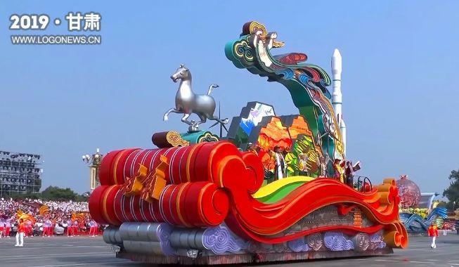 彩车设计以“现代元素+历史元素”为主基调,撷取自敦煌壁画中的祥云托举起甘肃这柄“玉如意”。“玉如意”上天马纵蹄奔腾、飞天凌空飞舞、火箭直冲云霄,动感十足,气势磅礴。其间,祁连山高大雄伟,洁白的雪山、丰收的田野,以及风力发电机、石油抽油机等洒落在广袤的大地上,雄奇美丽,生机勃勃。身着裕固族、东乡族、藏族服饰和敦煌舞蹈服饰的展演人员随着音乐翩翩起舞,展现陇原儿女奋发向上的时代风貌。——甘肃日报