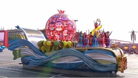 彩车着力体现新疆各族人民“像石榴籽一样紧紧抱在一起”,在大石榴造型的球形屏幕上呈现出色彩饱满、形象逼真的巨大石榴,从石榴籽中涌现出一张张新疆各族少年儿童的笑脸。彩车还以浮雕、彩绘等多种表达方式,展现了新疆的绿洲文化、草原文化、军垦文化、城市文化、丝路文化。——新疆日报