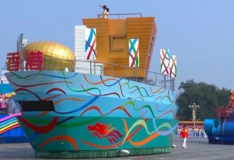 彩车造型简洁明快仿佛一艘巨轮,船体上绘有各色彩带和一条昂首正欲腾飞的巨龙,寓意“东方之珠”乘风破浪。“巨轮”之上,一座形似金色大鼎的装置镶嵌着显示屏,正播放反映香港城市风光和发展成就的影片。——中国新闻网