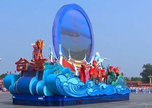 车头红色台湾字样颇为醒目,车底一朵朵蓝色浪花托起富有闽南风情的古厝屋顶,四周则环绕着几名身着鲜艳台湾少数民族服装的青年男女,他们正向人群挥手致意。彩车上最引人注目的是一块巨大圆形屏幕,其一面显示“同为一家人,共饮一江水”,另一面显示“为实现民族伟大复兴推进祖国和平统一而共同奋斗”。——中国新闻网