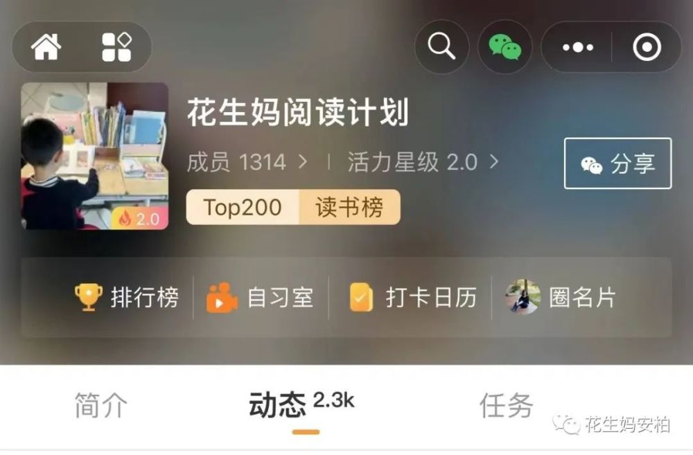 比如花生妈陪你读好书阅读计划,现在已经进行到了第三期。阅读习惯的养成,兴趣虽然占了很大因素,但是一开始也需要一个氛围,就像你到自习室每个人都在自习你也就会学习,到了图书馆每个人都在看书你也会很自然的看书,如果你和朋友一起健身也更容易坚持。阅读计划中虽然有我的很多分享,其实还有一个很大的作用就是氛围,大家做同一件事情,也会比一个人做更容易坚持。