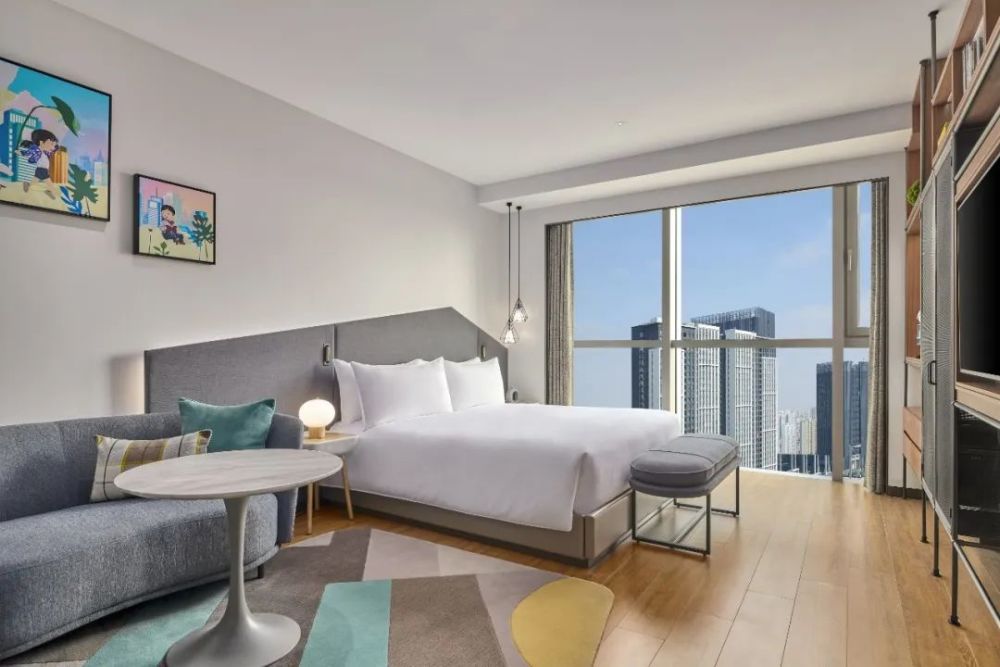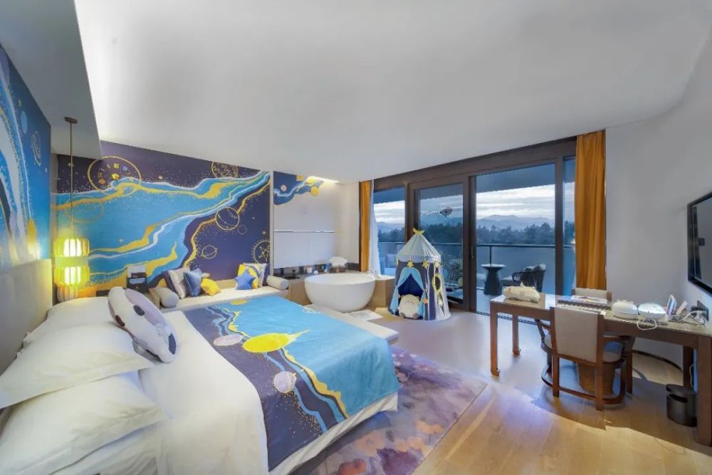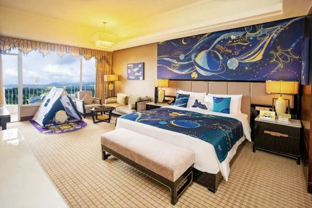 在成都三岔湖环球融创洲际落地的“星河之程”创意IP,以酒店旁天府国际机场为设计方案 切入点,航天为主题,融入天府国际机场、丹景台等建筑, 赋予星空深蓝调,运用抽象艺术和肌理质感组合的插画风表现,打造具有科幻神秘感不失高级感的主题亲子空间,并在客房中添加了许多亲子互动小游 戏。