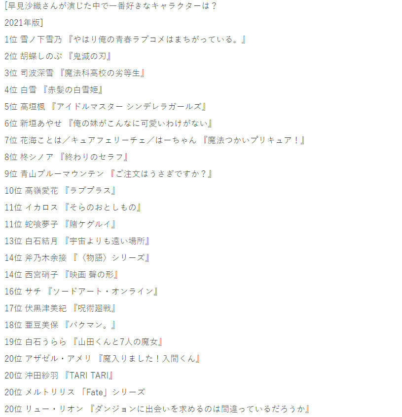手机访问:wap.265xx.com声优早见沙织配音的角色,《鬼灭》蝴蝶忍仅是第二,前十名已出