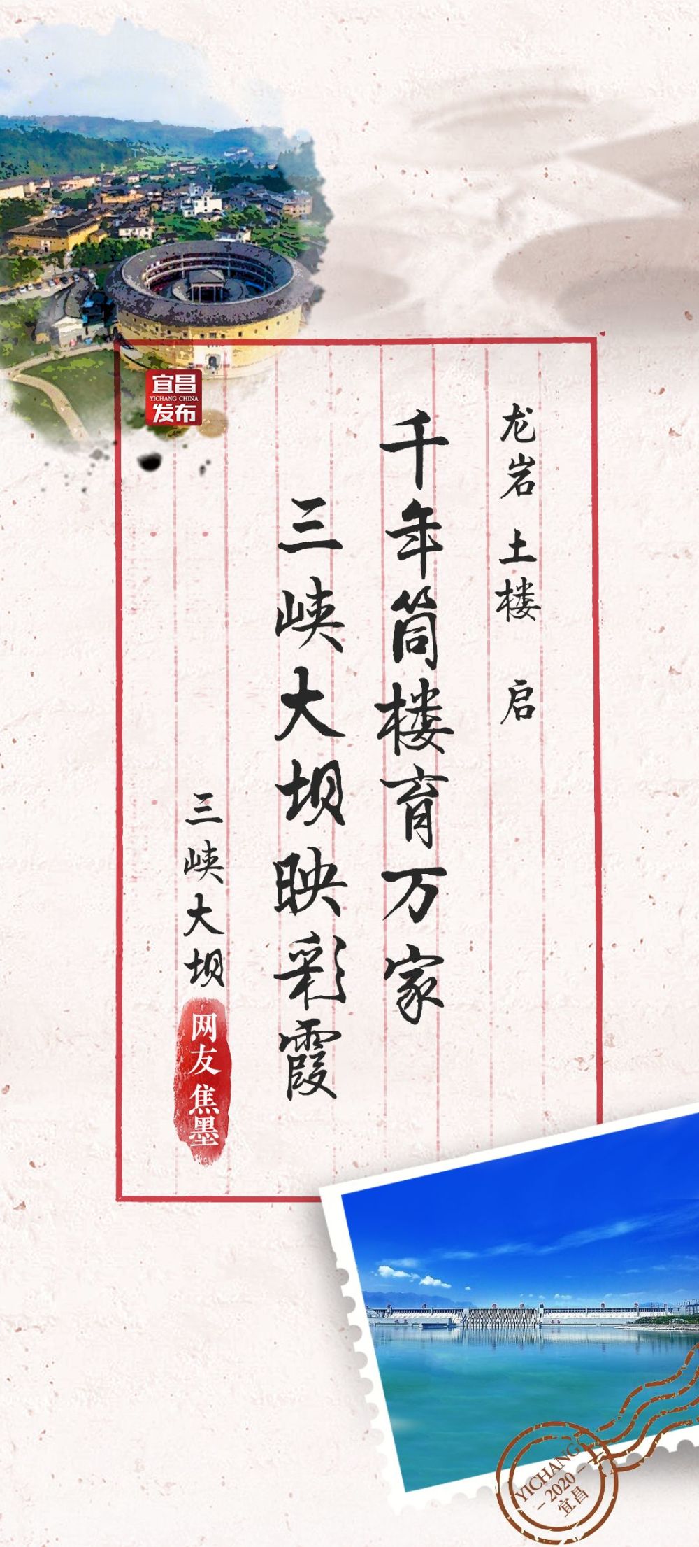 千年筒楼育万家,三峡大坝映彩霞。