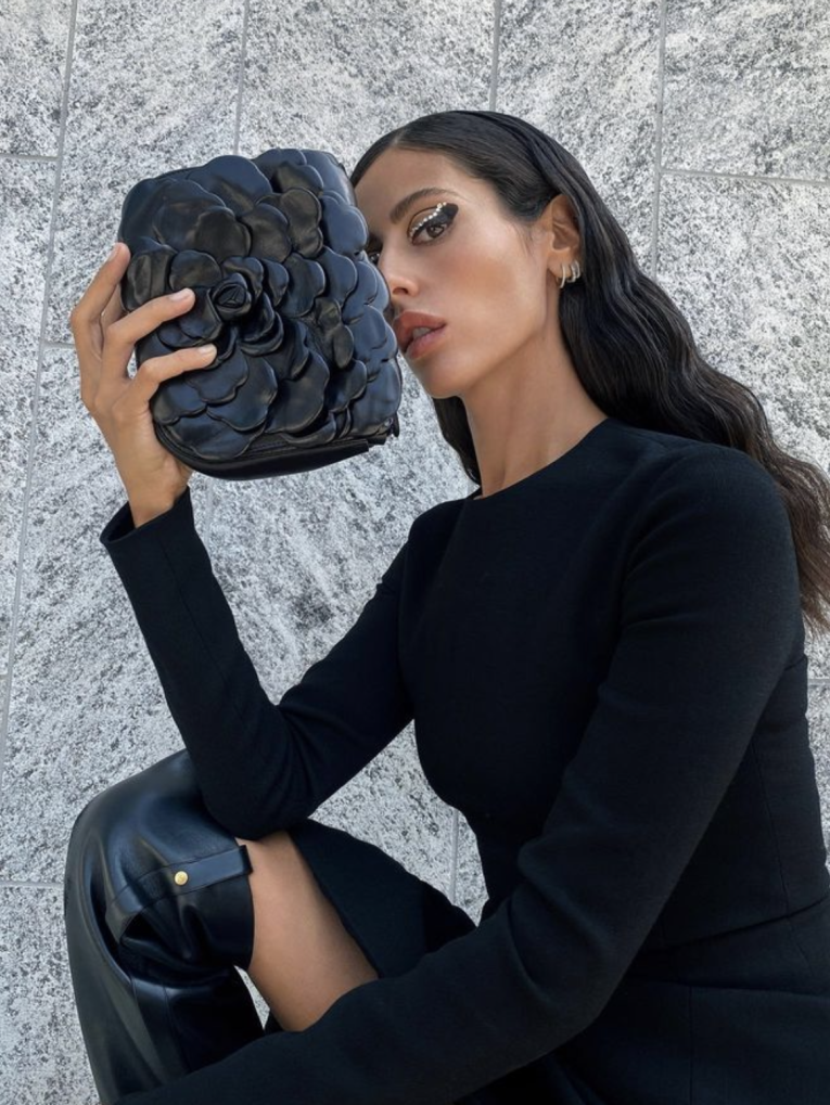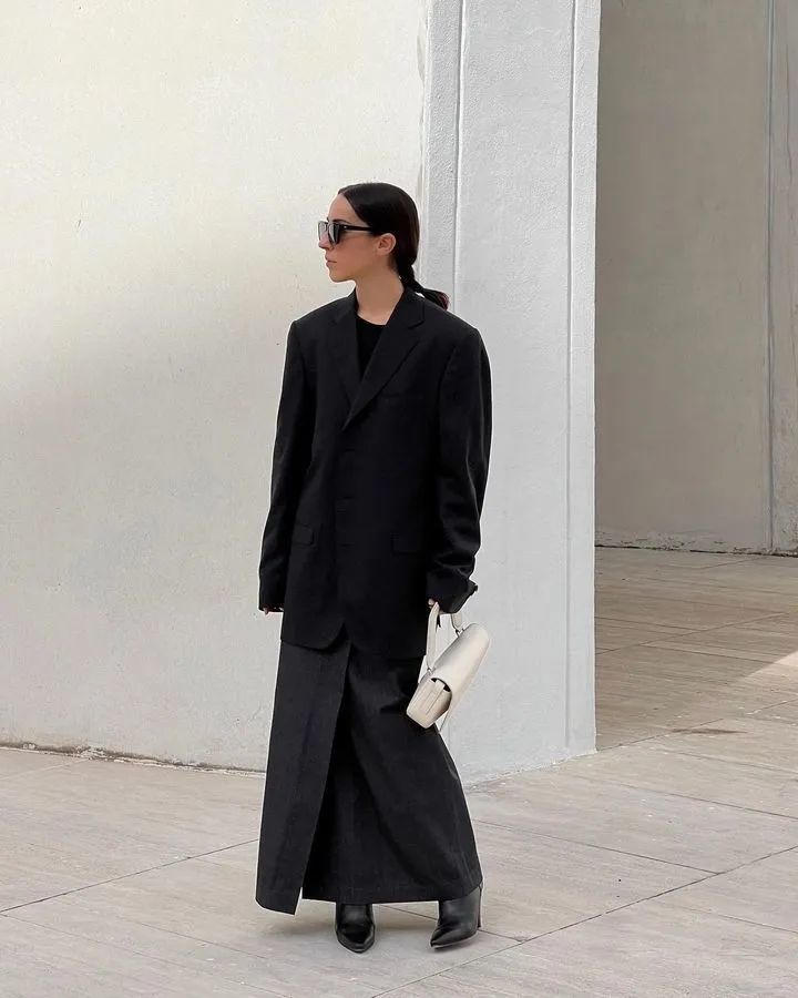 如果你自觉没有球花的气场,就在廓形和配饰的选择上加入一些“进击的形状”,像博主Sophia Ippolit这样,选择有棱角的廓形单品,增强气场。
