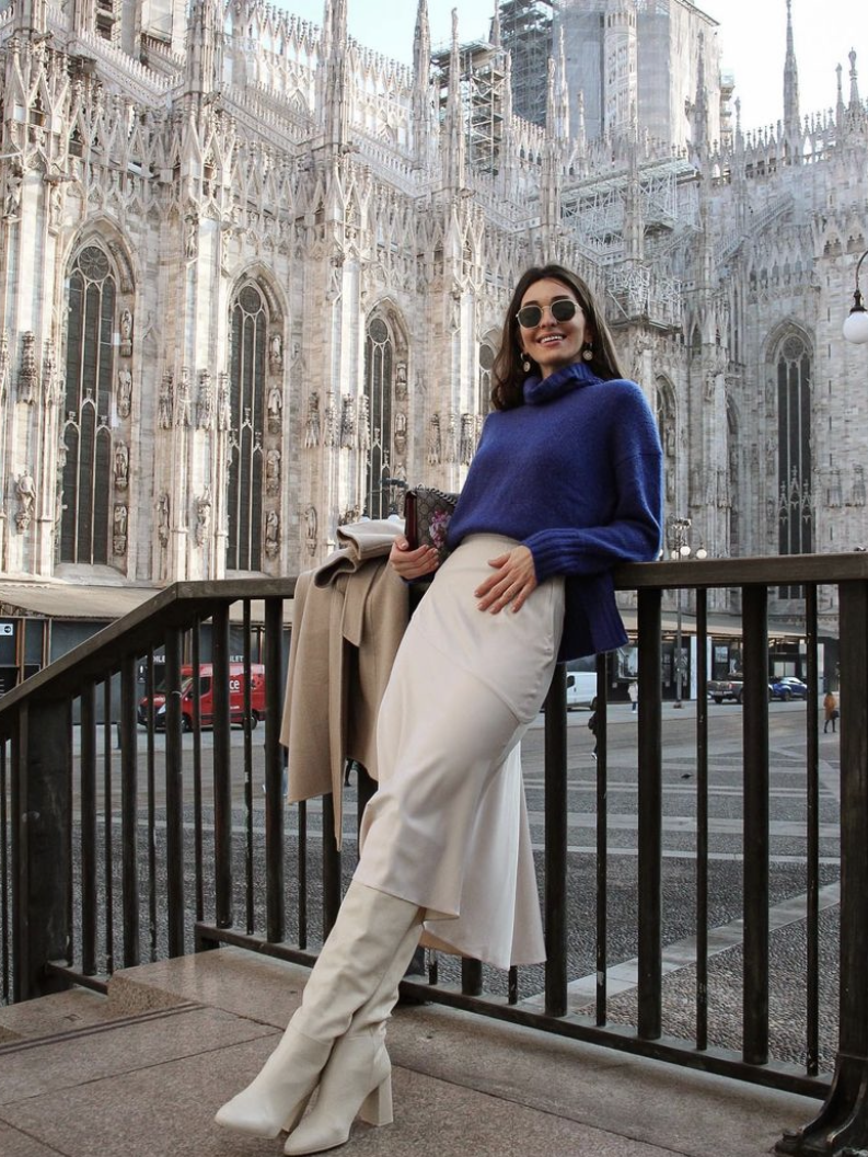 它的领口、下摆、袖口都是收紧的,也就代表它可以扎进勾勒曲线的裹身半裙里,保暖的同时,脖颈线条、腰臀曲线还能展示出来,这很意大利!