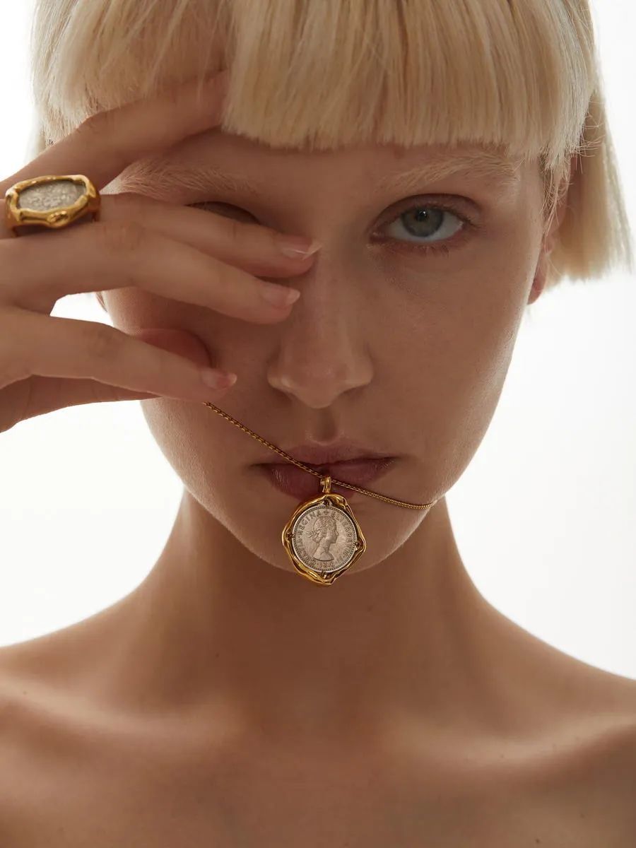 这个系列用的是英国六便士旧币,边缘用环保黄铜包边,不规则的熔断边缘和旧币的组合,复古有故事感,像是意大利女人从古典中汲取灵感的设计。