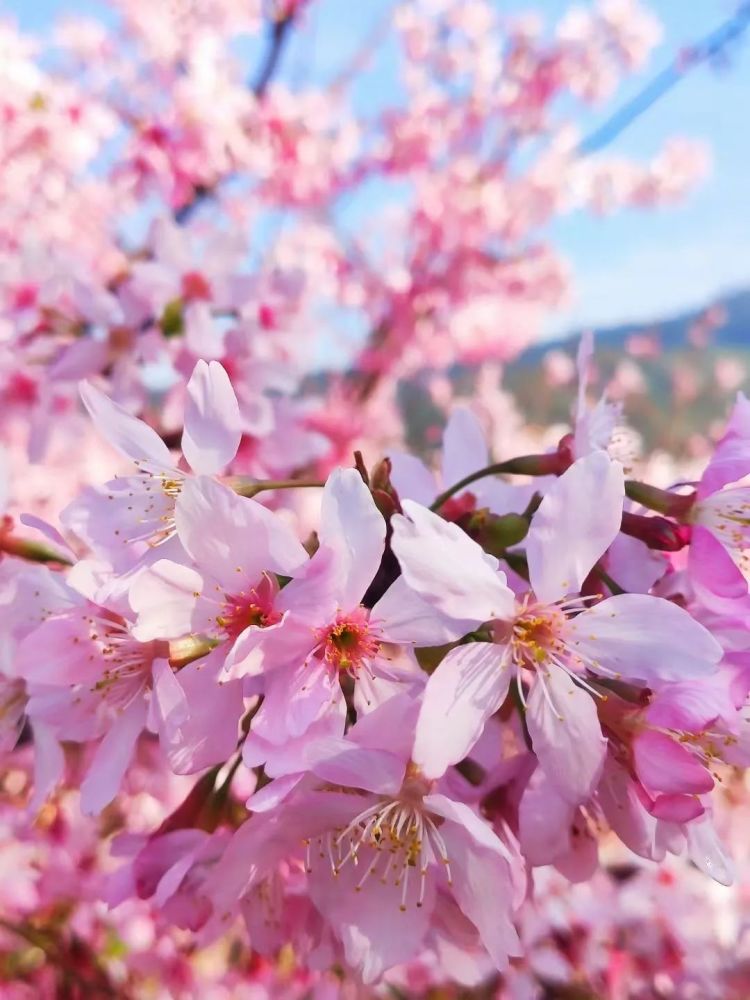 漫山遍野的红粉樱花,连着绵远的青山薄雾,仿佛一幅水墨画,缥缈到似乎误入仙境。