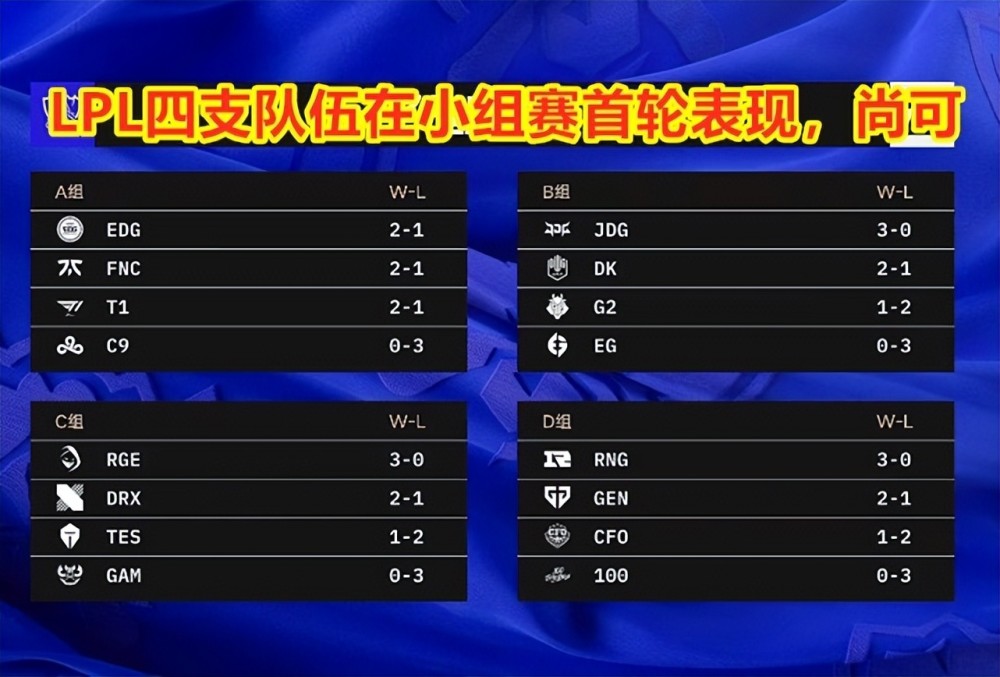 英雄联盟S12全球总决赛,小组赛首轮比赛已经战罢!来自LPL赛区的四支队伍,他们在首轮的表现,完全可以用“尚可”来形容!其中JDG和RNG的表现,远超出玩家在赛前的预测;EDG属于尚可,也在意料之中;而TES的表现,则是属于是自己将自己给玩砸了的典型。