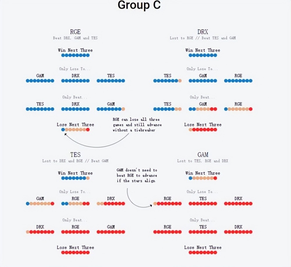 第四种情况,TES在第二轮击败RGE和GAM,但再次输给DRX。此时必须满足GAM能击败RGE,且DRX击败RGE的极端条件,TES才有机会通过加赛争夺小组出线权,否则TES直接小组出局。