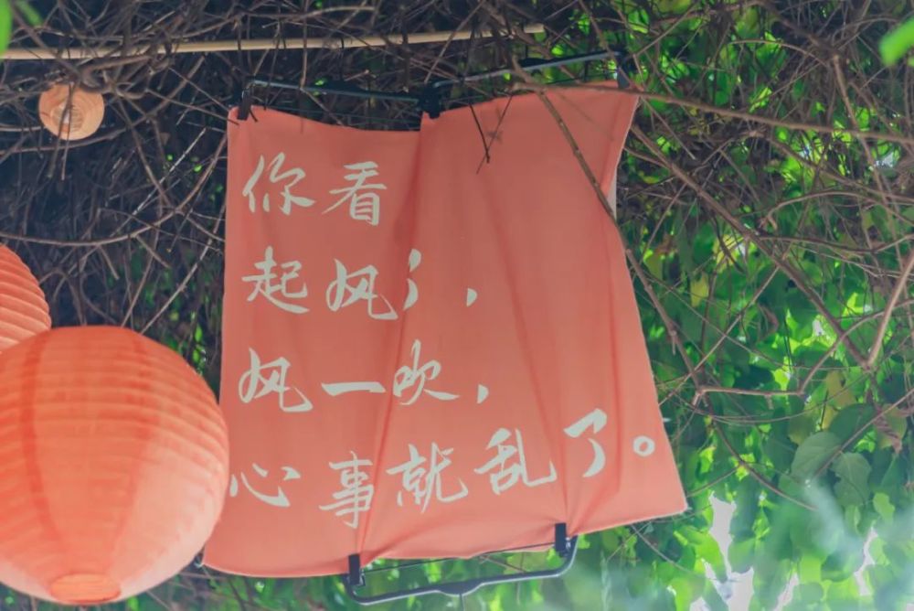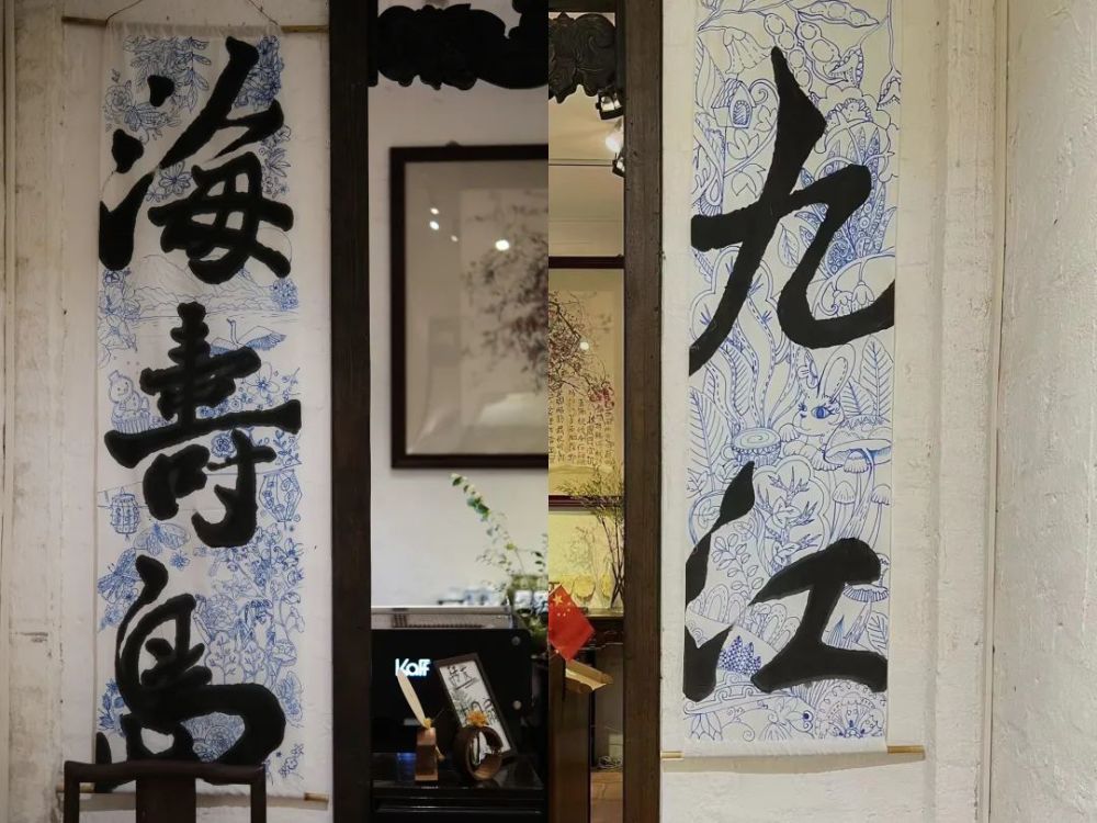 阿So介绍,开业时装置时间有限,多得有朋友们的帮忙。庭院的艺术条幅,是朋友爸爸(九江当地的书法老师)亲手设计书写,底纹涂鸦开业前两天找到大学同学帮忙连夜手绘制作。