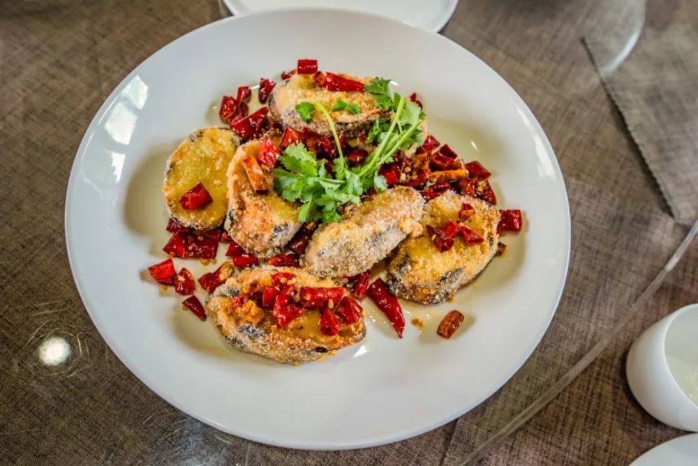 创新融合菜——避风塘茄子是店里的独创的爆款,曾获九江主题美食竞赛大奖。一口咬下,酿茄子的肉汁在嘴里爆开,外酥里嫩的口感让你根本停不下来。