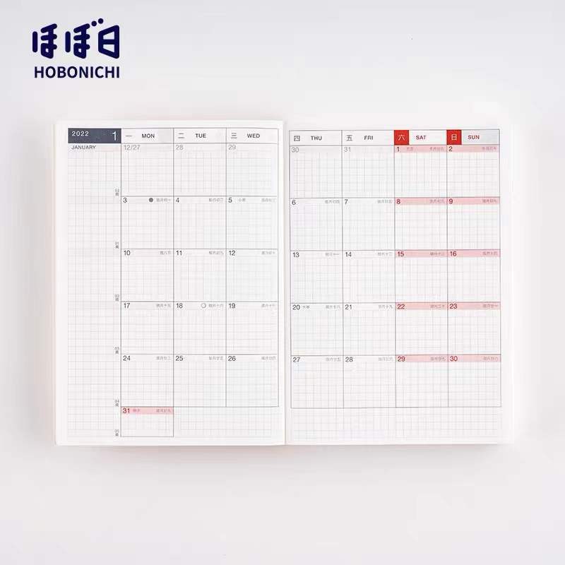 Hobonichi Weeks 是一本固定日期的周记。内页依旧是巴川纸。主体部分页面左侧是带有一周日期的部分,可以根据日期进行记录或者规划,右侧是方格纸,可以根据需要自由记录。它的排版布局算得上周记体系中比较经典的体系,薄薄一本,安心陪你一年不成问题。