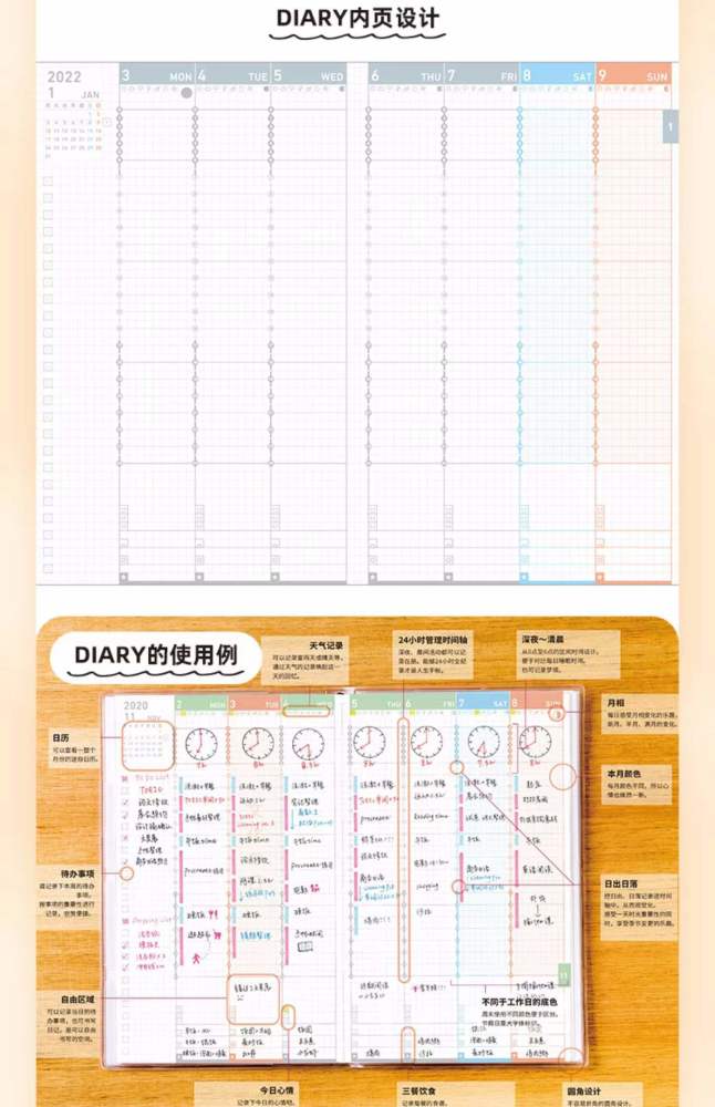 和国誉自我手帐的纯时间轴版本相比,中置时间轴的设计给了一部分希望在手帐上体现生活记录的人更多空间,很多使用者选择以时间轴为界,左侧进行规划,右侧在晚上进行实际发生的事情的回顾,结合左右两侧,形成一个完整详实的生活记录。