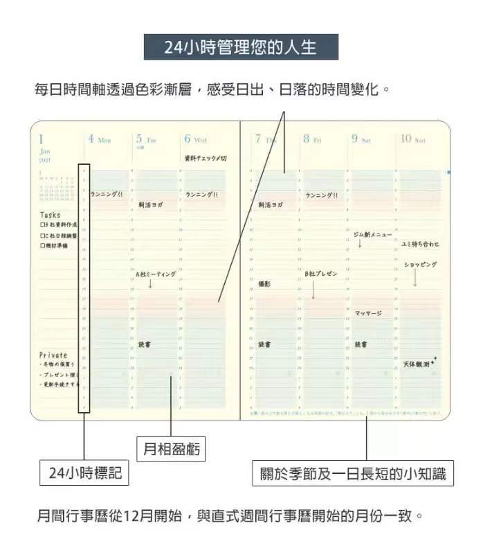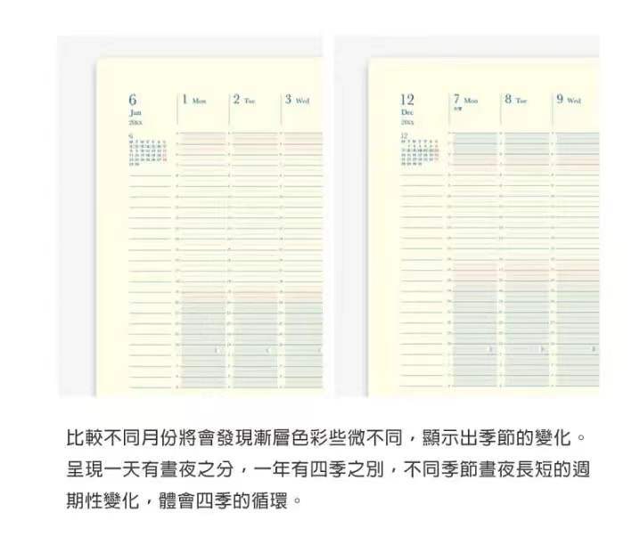 除了国誉自我之外,MIDORI 的月相时间轴也受到手帐爱好者们的高度评价。MIDORI 月相时间轴根据月相的变化进行设计,记录页面上会标注月相的盈亏,整本手帐的主题也围绕月相展开。不同月份的页面还会根据昼夜时间不同有颜色的变化。哪怕不进行其他的装饰,页面看上去也相当美观。