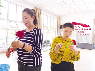 在为期3个月的培训期间,杜倩多数时间都在社区陪孩子们,上午教他们花艺,中午组织他们原地吃午饭、休息。杜倩说,三个月的时间里,孩子们变化很大。就像娜娜,在培训学习中,从前没有工作意识的她现在也会说“我想工作,我想挣钱养妈妈”。娜娜的手臂比较僵直,但看着她认真学习时的神情,很让人感动。