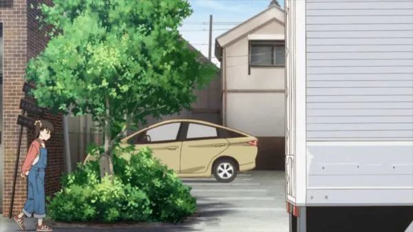 我们有恰好足够的时间观察到这个细节, 直到这两位路人被小葵的包挡住, 此时日向还没注意到小葵的朋友们. 日向发现小葵买了自己一直没勇气送出的同款纪念品, 变得更加沮丧. 随后小葵一行人离开了车站, 独留一个短暂的画面——日向吃惊地站在原地. 最后动画用了和这一段第一卡对称的构图结束了这系列镜头, 保持了连续性并且明确了角色间的距离.