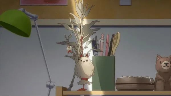 在日向醒来之前, 动画又插入了一个短暂的过渡镜头, 它同样预示着剧情转向: 晨曦悄然落在池袋纪念品上——那是日向想送给小葵的一个以猫头鹰雕像池袋藏为原型的小物件. 就像当地的忠犬八公雕塑以及摩艾 (Moai) 雕塑一样, 这尊 "长着羽毛" 的雕塑也是涩谷出门碰面的热门地点.