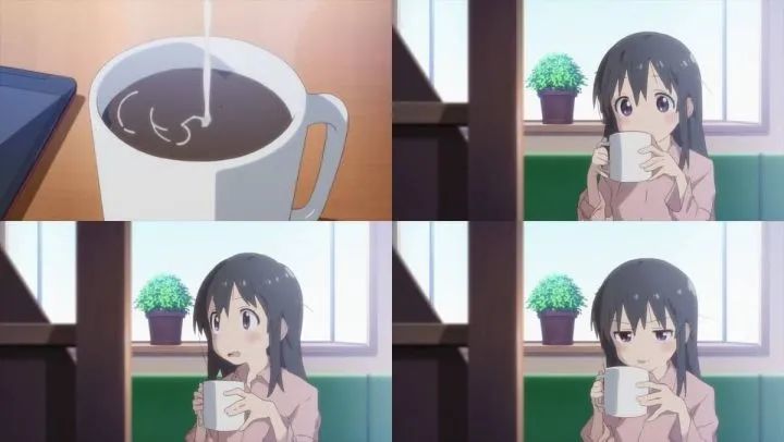 这是观众首次看到睡眼惺忪, 头发散乱的日向, 这个细节丰富了此刻平常的画面. 拿铁热气腾腾, 升起烟雾, 与透过屋内的朦胧光线完美结合. 一种独特的取景方式就从这里开始出现: 通过物体或建筑的设置, 营造像牢笼一样的紧闭空间, 将人物禁锢并孤立到画面的一小部分中.