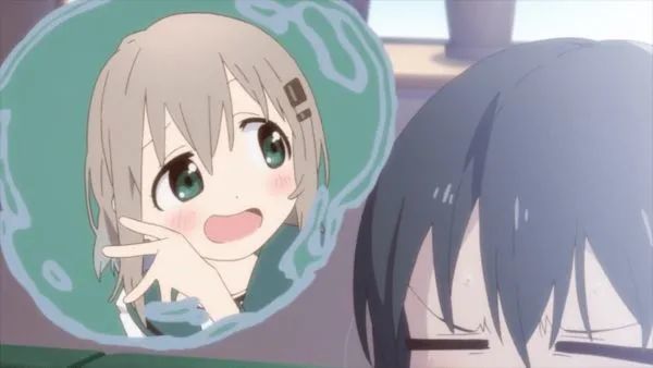在第二天日向醒来的场景中, 我们可以注意到室内构图也别具匠心: ちな通过巧妙的机位并辅以传统手段, 拍摄出错综复杂的几何关系, 使日向脸边的窗户成了构图的中心. 事实上, 唤醒少女的不是闹钟亦非父母, 而单纯是早已高挂天空的太阳——这一点由三分构图法清晰地强调了出来. 这个太阳与迄今为止出现于这部动画中的太阳在风格上大有不同: 它平平无奇, 而又耀眼非凡, 这是潜入那些在周末无所事事之人家里的晴朗阳光.