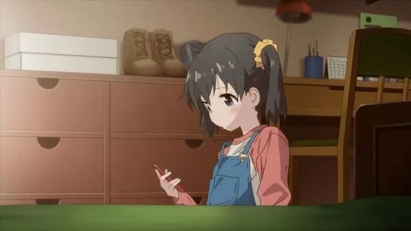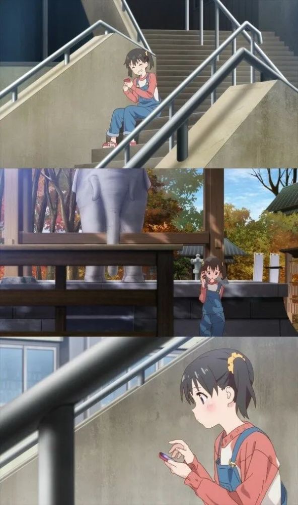 正如之前所料, 我们可以再次看到将日向禁锢起来的场景, 或者说镜头将她安置在画面边缘的三分之一处——在此我无疑要引用 kViN 的话, 这 "几乎暗示着应该有人在她身旁". 吊带裤外套隐隐约约好似一件保护内心的盔甲, 同时这当然也是特别适合户外玩耍的耐脏衣服, 因而也突出了日向个性中最孩子气的一面.