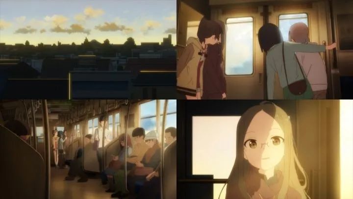 再次切换视角. 依靠动画层 (animation layer) 的背景动画, 归途电车窗外的景物尽可能还原了现实中行进车辆的视野. 除了这些转瞬即逝的移动画面, 我们还可以通过一个完整的景框欣赏东京. 东京作为富士山的前景, 后者被强光所覆盖. 当香澄与小葵对话时, 同样的光也将打在香澄身上. 这种摄影上的同质性强化了该场景想传达的信息: 得益于爬山的经历, 小葵已经克服了对同龄人的恐惧.