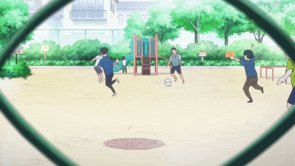开场第一个镜头机位非常靠近地面, 画面中一些龙套角色正在踢足球. 他们很快便跑出了观众的视野, 为的就是给背景中的主角们腾出空间. 我们很难不注意到这一段与《埃罗芒阿老师》第十一话中的某个镜头 (6:05 左右) 颇为相似: 一群孩子在公园里传球, 镜头则被防护网紧紧地约束住 (tightly framed). 那个片段也是ちな画的, 不过当时他还只是担任原画和 layout.