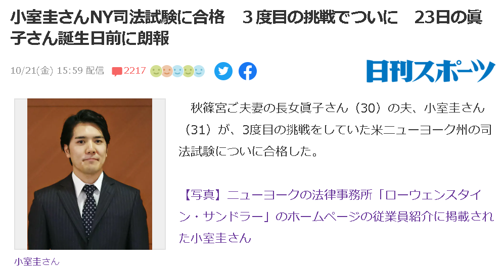 小室圭通过纽约司法考试,终于赶在23号真子公主生日前“三战上岸”!