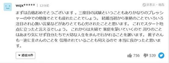 首先祝贺你合格。因为是第三次考试,所以在很大的压力下学习,一定很累吧。从结婚之初开始就因为家世的事情受到各种关注,被大家议论估计也是身心俱疲吧。现在可以说是站在了新的起点上。今后公主夫妇要建立自己的家庭,希望你们不要太在意周围的事情,自己走重要的人生。真子公主也很信任丈夫,真是太好了。
