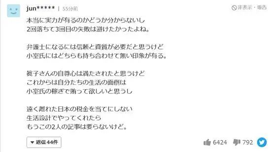 小室通过考试的消息发布几分钟后,“小室圭”“美国纽约州司法考试”成为推特上的热门话题。“恭喜!”“在这样的压力下,居然通过了考试…恭喜你!”“松了一口气”“我觉得真子公主压力很大,希望你能好好照顾她”“就像我自己的事情一样令人高兴”“在要被全国人民知道考试结果的压力下终于合格了。太棒了……好厉害啊……”“小室圭,真子,祝你们幸福!”等等,对于在“三战”压力下顺利合格的小室,日本民众的慰劳声不断。