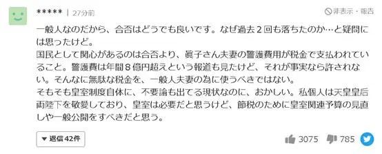 国民关心的不是是否合格,而是真子夫妇的警卫费用是用税金支付的。我看到报道说他们每年的警卫费居然超过8亿日元,如果这是事实,就太说不过去了:不应该把如此高额的税金用在普通夫妇身上吧。