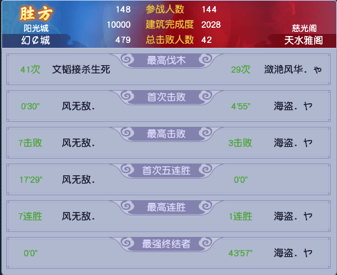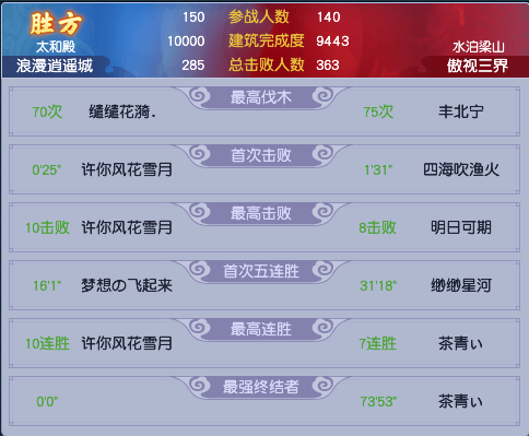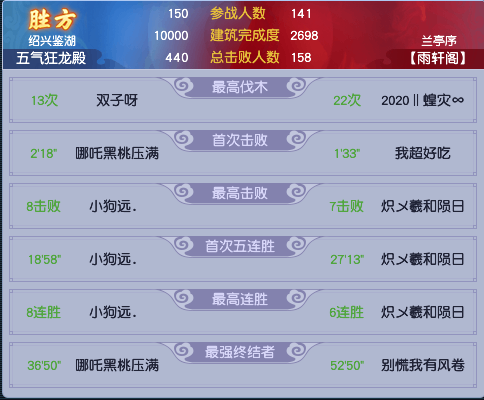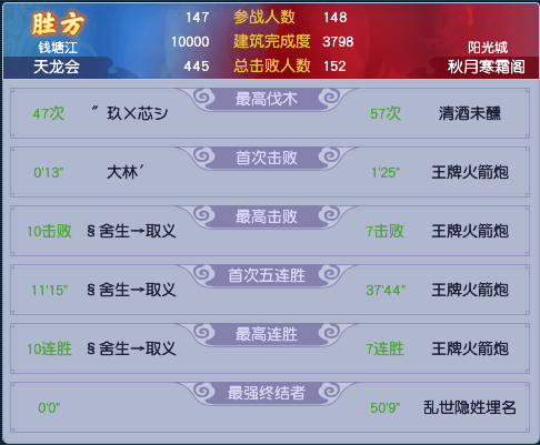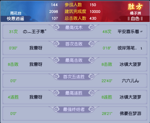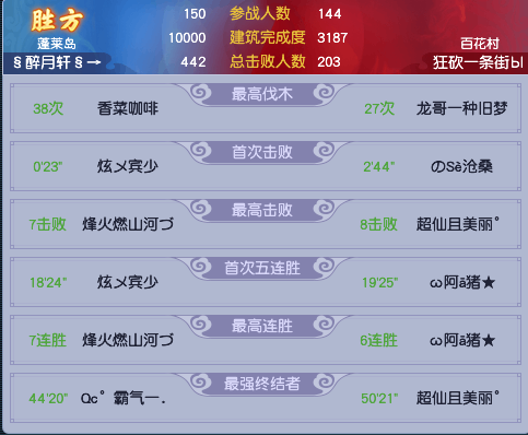 在赛前,各赛事玩家普及认为,这两个帮派的对决将是64进32阶段综合水平最高的。建设环节,义气先行充分利用红色方优势,以四个伐木点结成阵地后守株待兔,在击败人数和伐木进度上双双领先西游群英会,取得胜利。