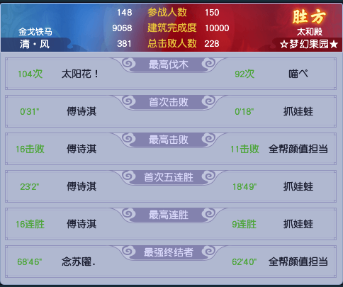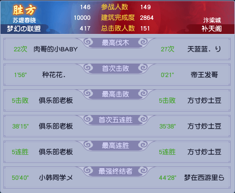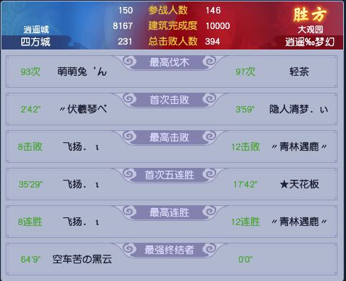 同样是综合实力相近的两个帮派,逍遥‰梦幻巧妙利用了红色方优势,采用阵地战的防守战术稳中求胜,最终拿下了四方城。