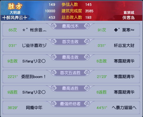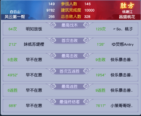 不得不说,两个帮派之间的差距有些明显,虽然侠客岛通过掩护自己的专业伐木队伍在比赛前期并没有让╅醉风弄云╆拉开太大的差距。但是,队伍综合实力的差距使得侠客岛的有生力量快速流失,比赛进行至三十分钟左右时,侠客岛的专业伐木队已经失去了屏障。