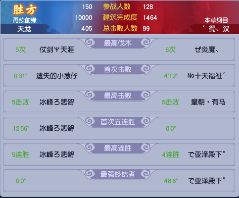 从参赛人数可以看出,′蜀、汉并没有完全做好参加年度赛的准备,他们的对手天龙竞技状态火热,在这场比赛中表现出了压倒性的统治力。